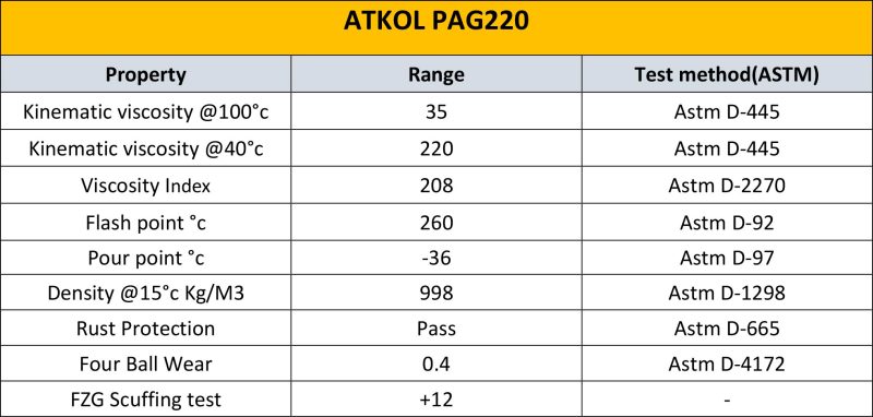 روغن دنده صنعتی ATKOL PAG220 روغن دنده تمام سنتزی است که با بهره گیری از روغن پايه پلی آلکیلن گلیکول PAG و مواد افزودنی ویژه به منظور روانکاری یاتاقان ها و چرخ دنده های مارپیچی، تحت شرایط بار و دمای بالا، تولید گردیده است.
